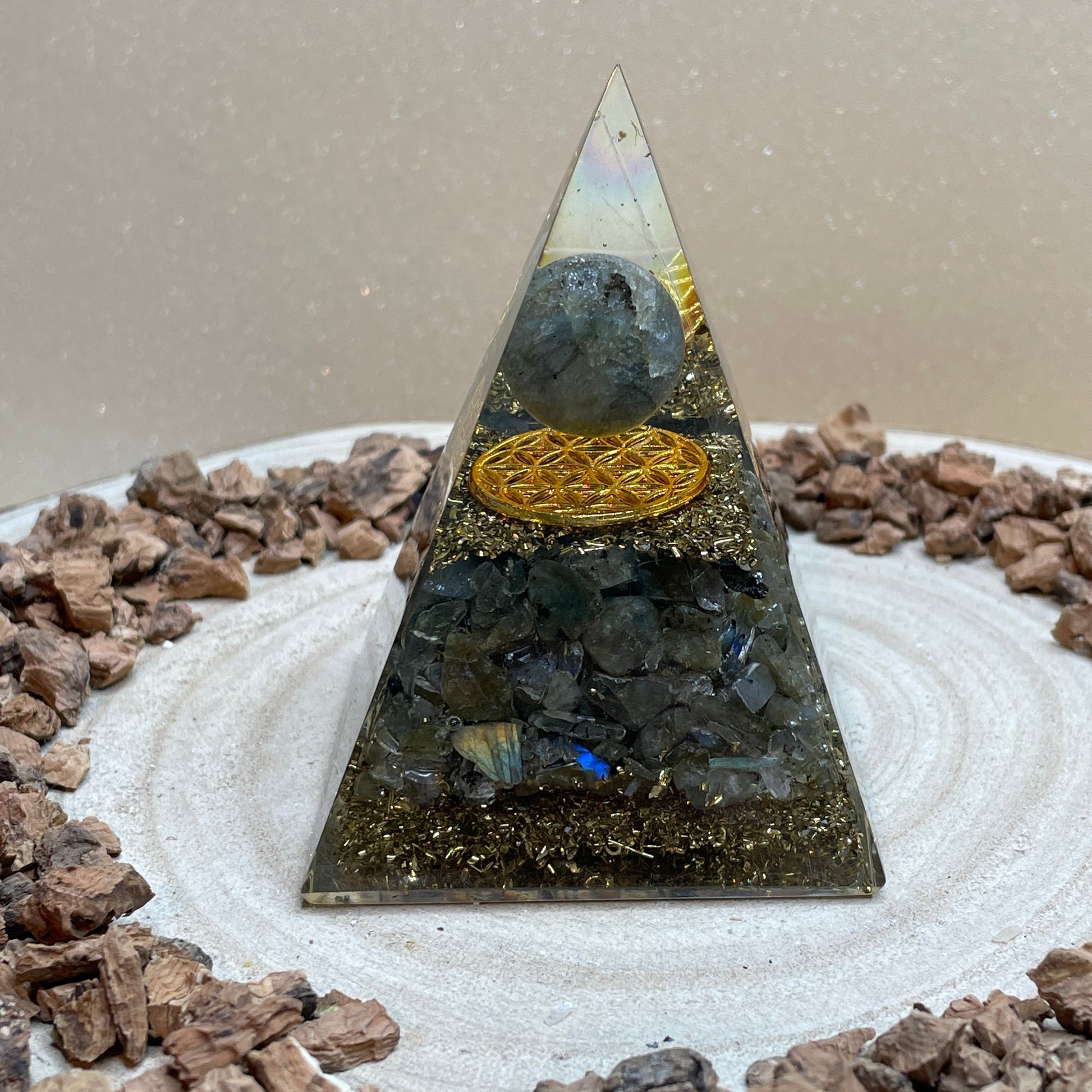 Deze orgonite piramide met Labradoriet is een krachtige energieversterker die negatieve energie omzet in positieve levensenergie. Labradoriet staat bekend als een beschermende en spirituele steen die je energie zuivert en versterkt. De steen helpt je intuïtie te verdiepen, beschermt tegen energieën van anderen en ondersteunt bij spirituele groei en zelfontdekking.