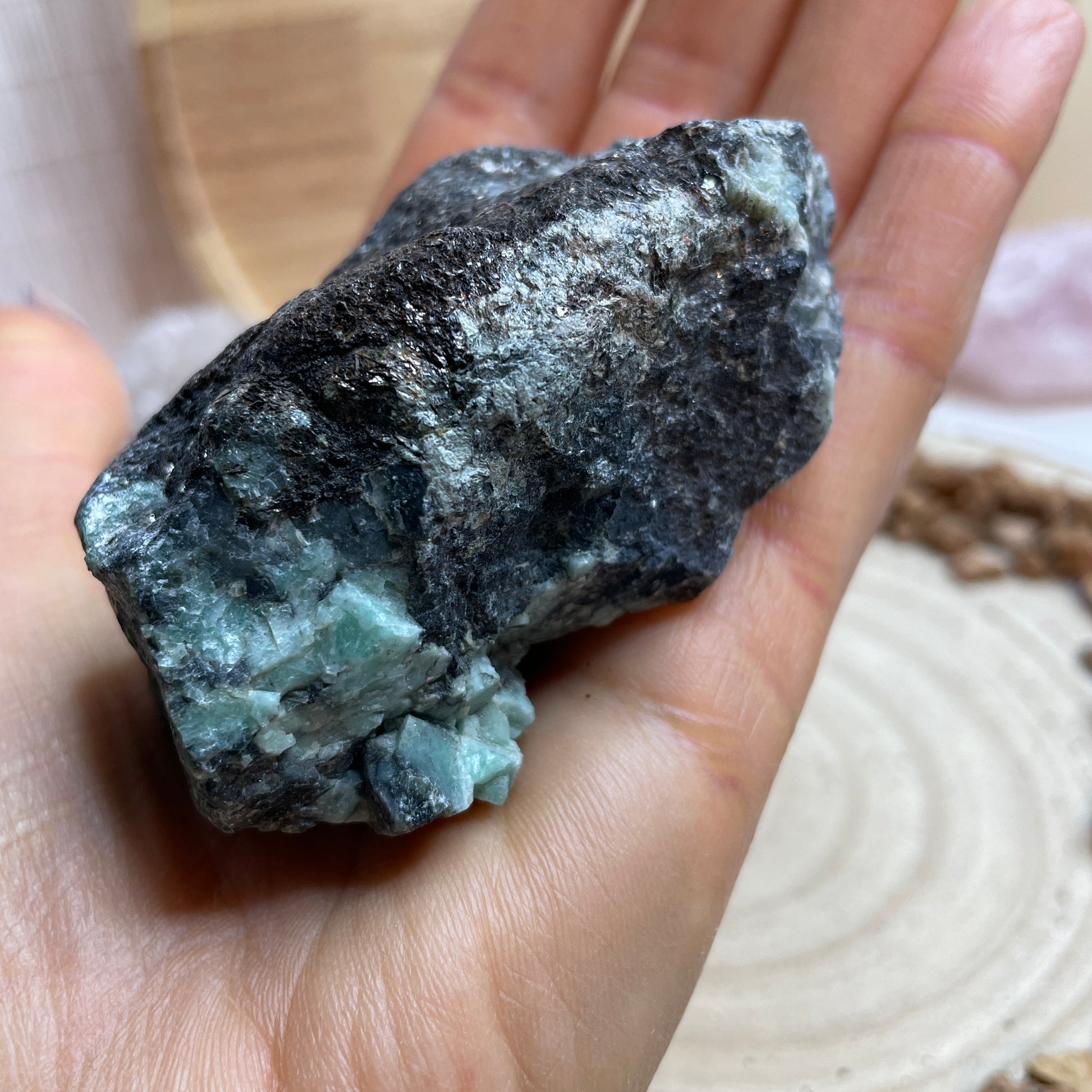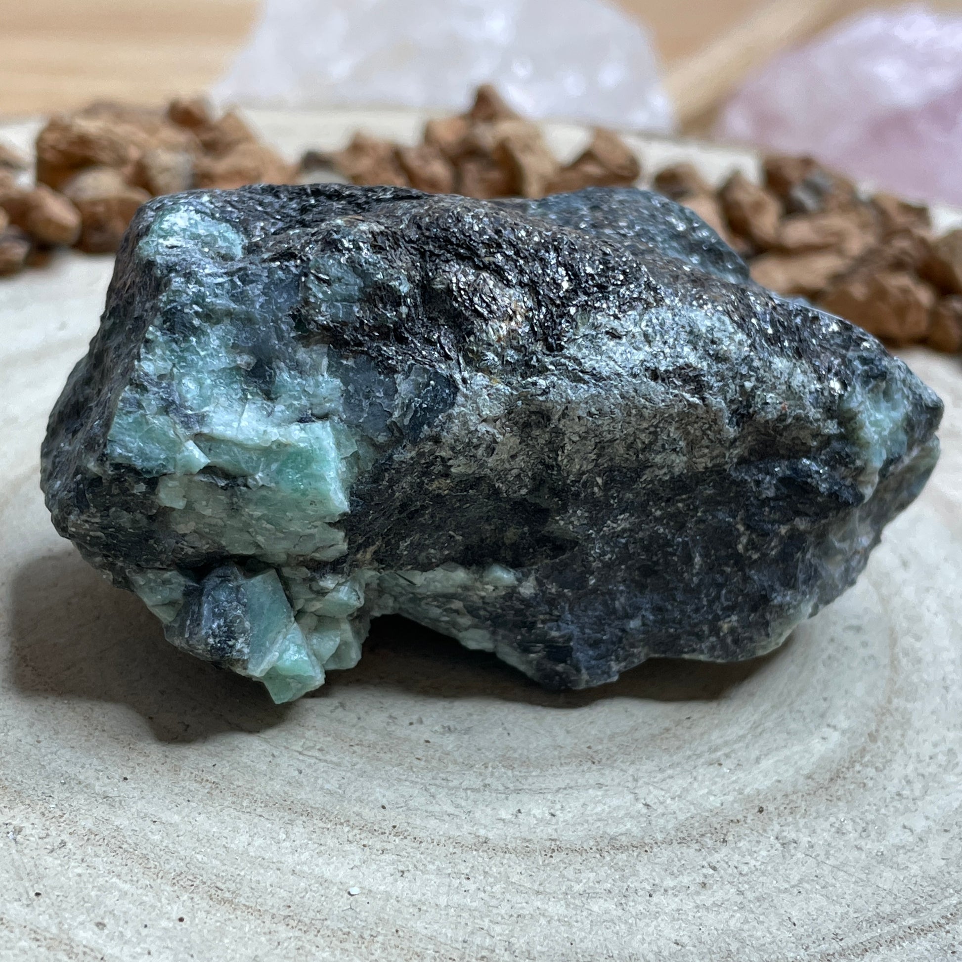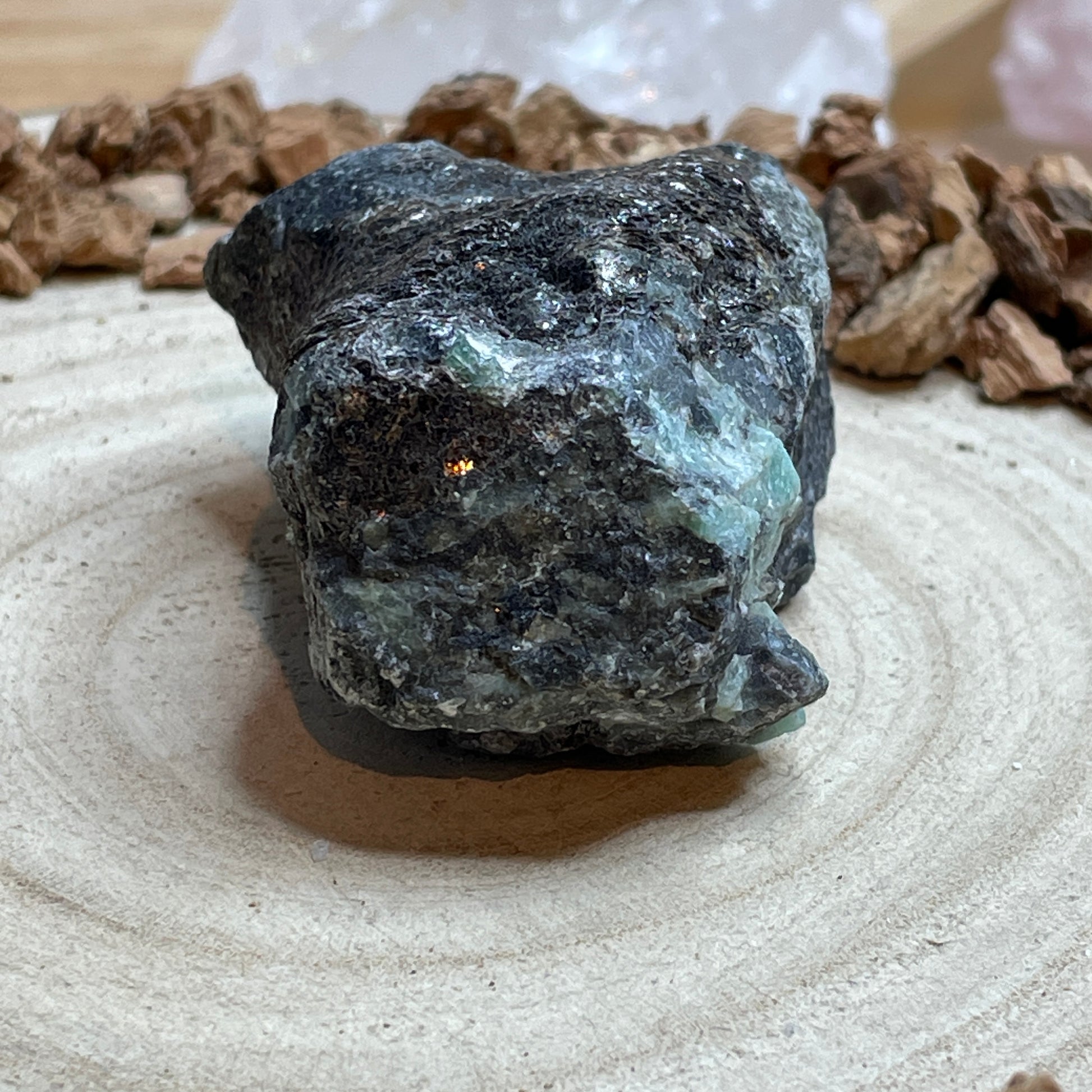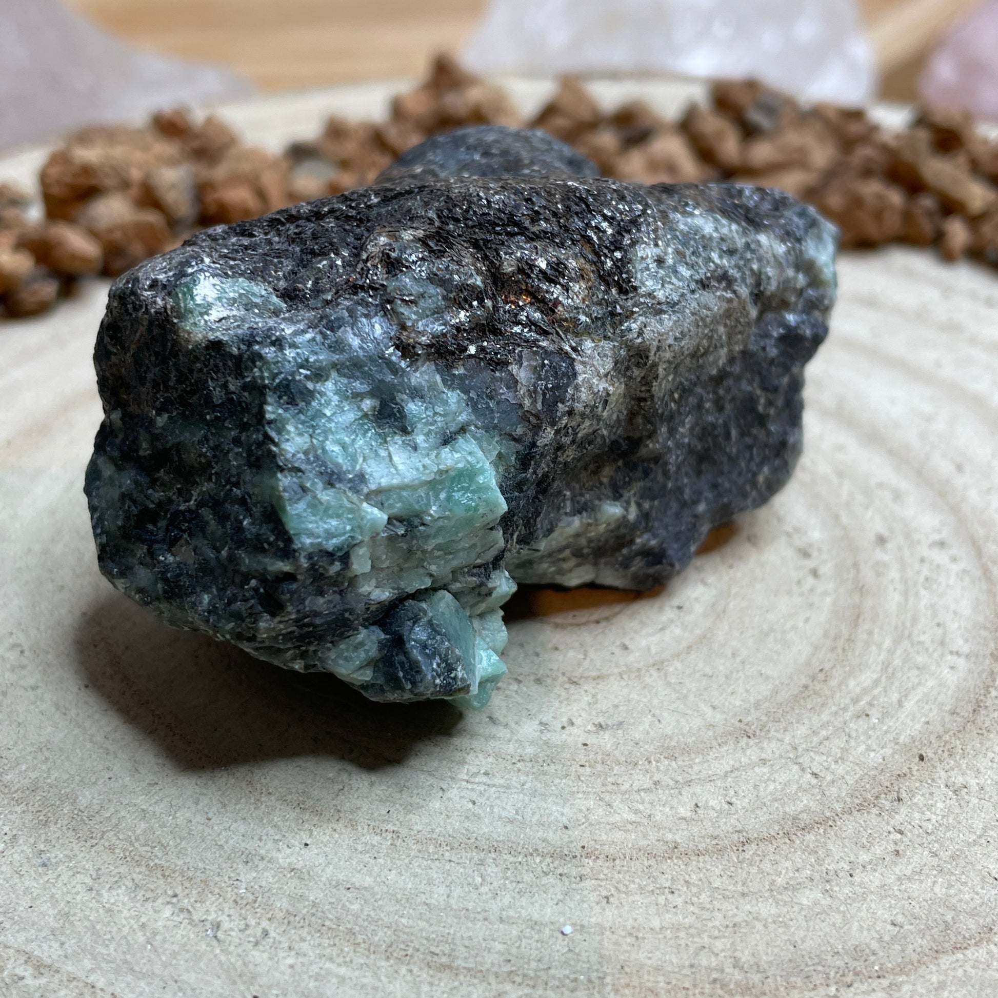 Smaragd in Biotiet is een bijzondere en krachtige combinatie van stenen. De groene smaragd staat symbool voor liefde, groei en vernieuwing, terwijl de zwarte biotiet zorgt voor aarding en bescherming. Samen brengen ze een mooie balans tussen hart en hoofd: ze openen je voor liefde en nieuwe inzichten, terwijl je stevig met beide voeten op de grond blijft staan.