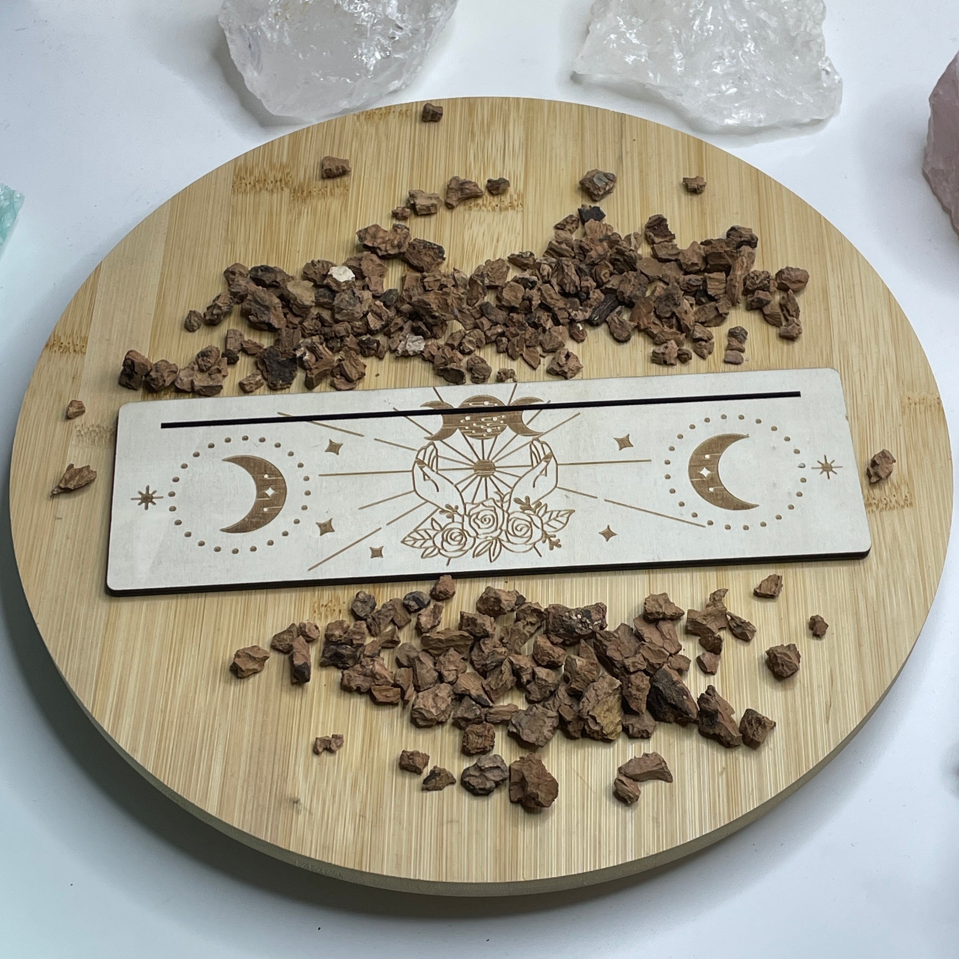 Deze houten kaartenhouder met de maanfasen is een mooie en handige manier om je tarot- of orakelkaarten neer te zetten. Leuk voor op je altaar, in je praktijk of gewoon in huis, zodat je dagkaart of affirmatie altijd zichtbaar is. Het natuurlijke hout en de maan maken er een sfeervol item van dat je rituelen en dagelijkse momenten extra speciaal maakt.